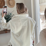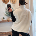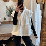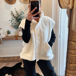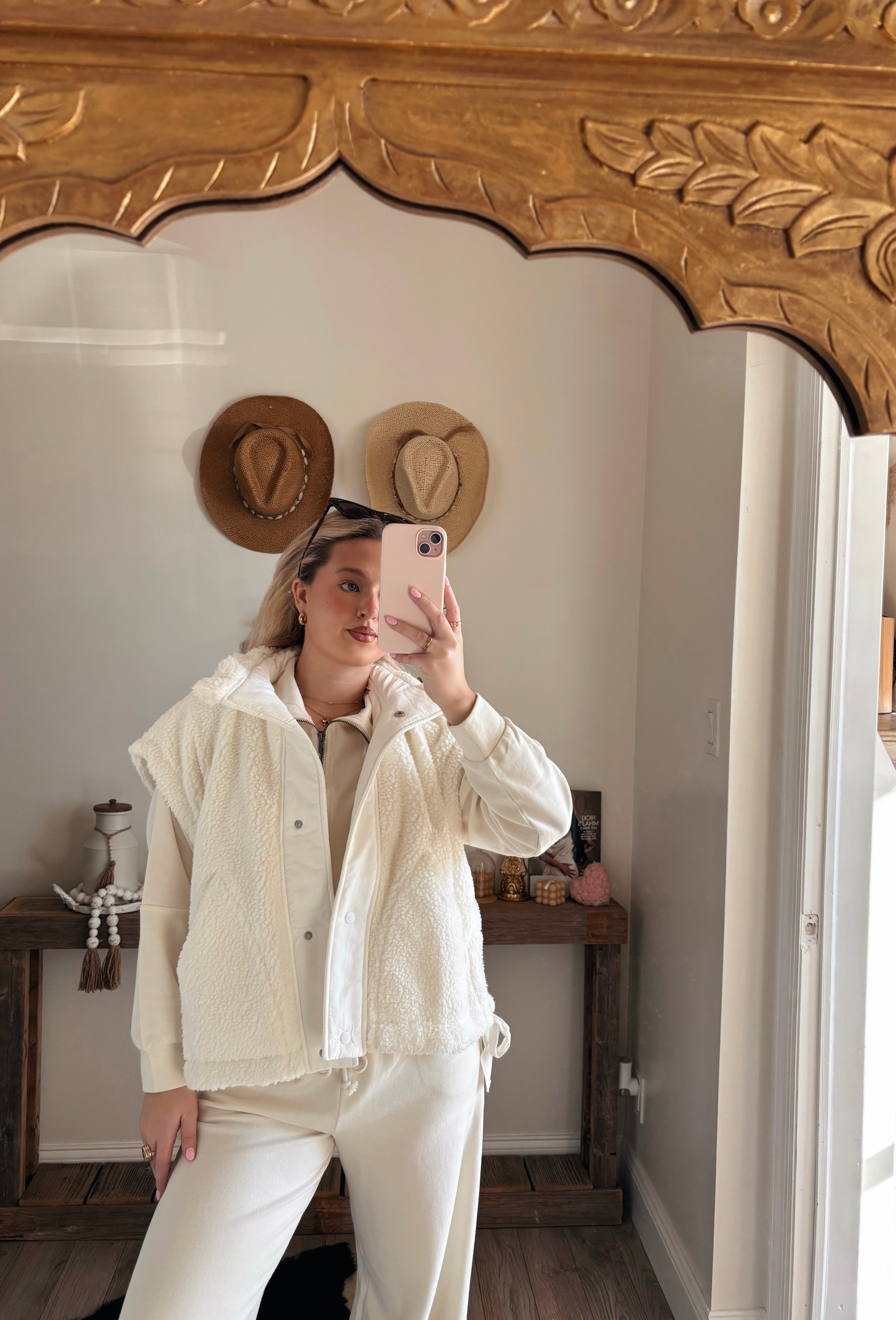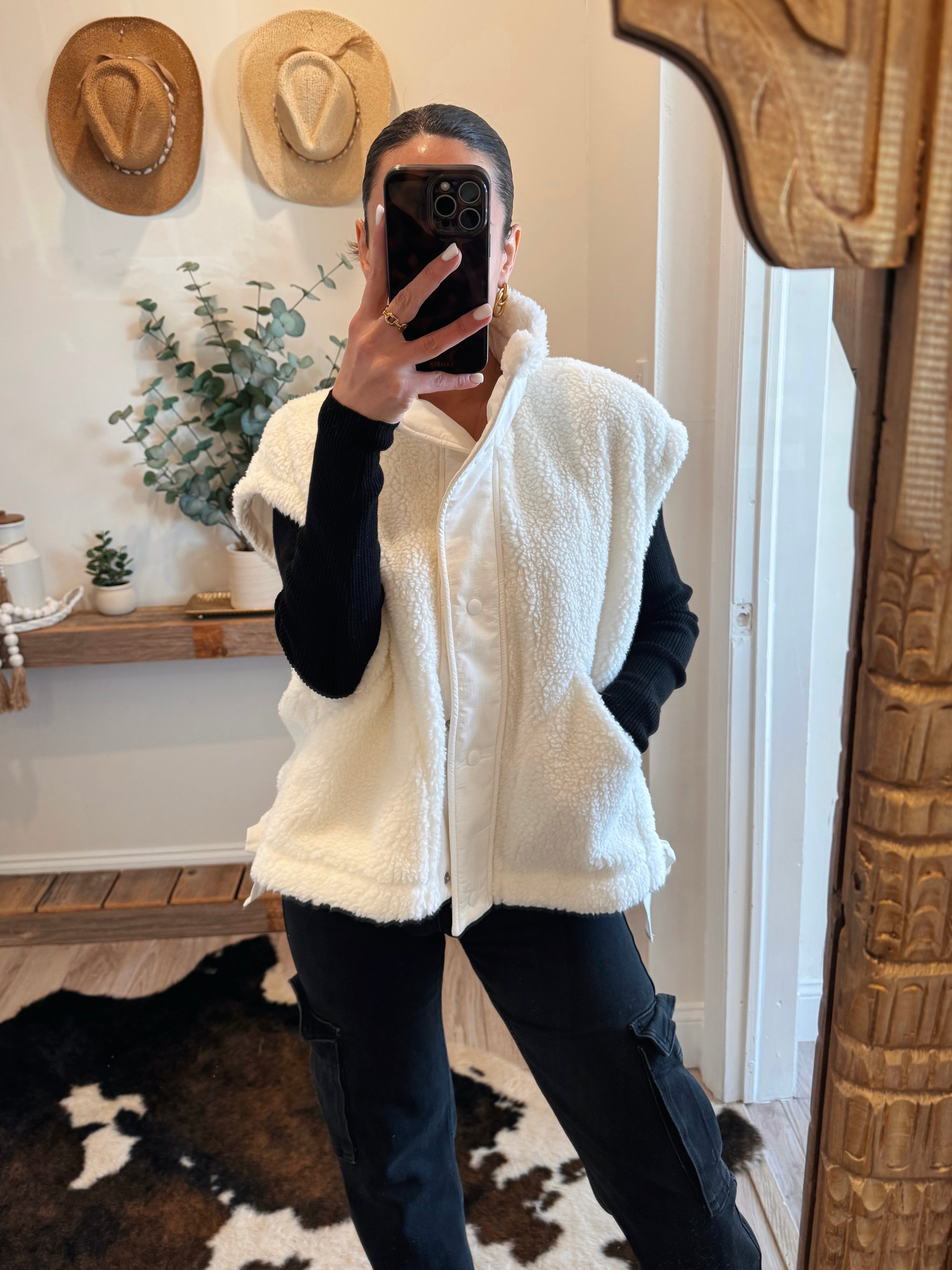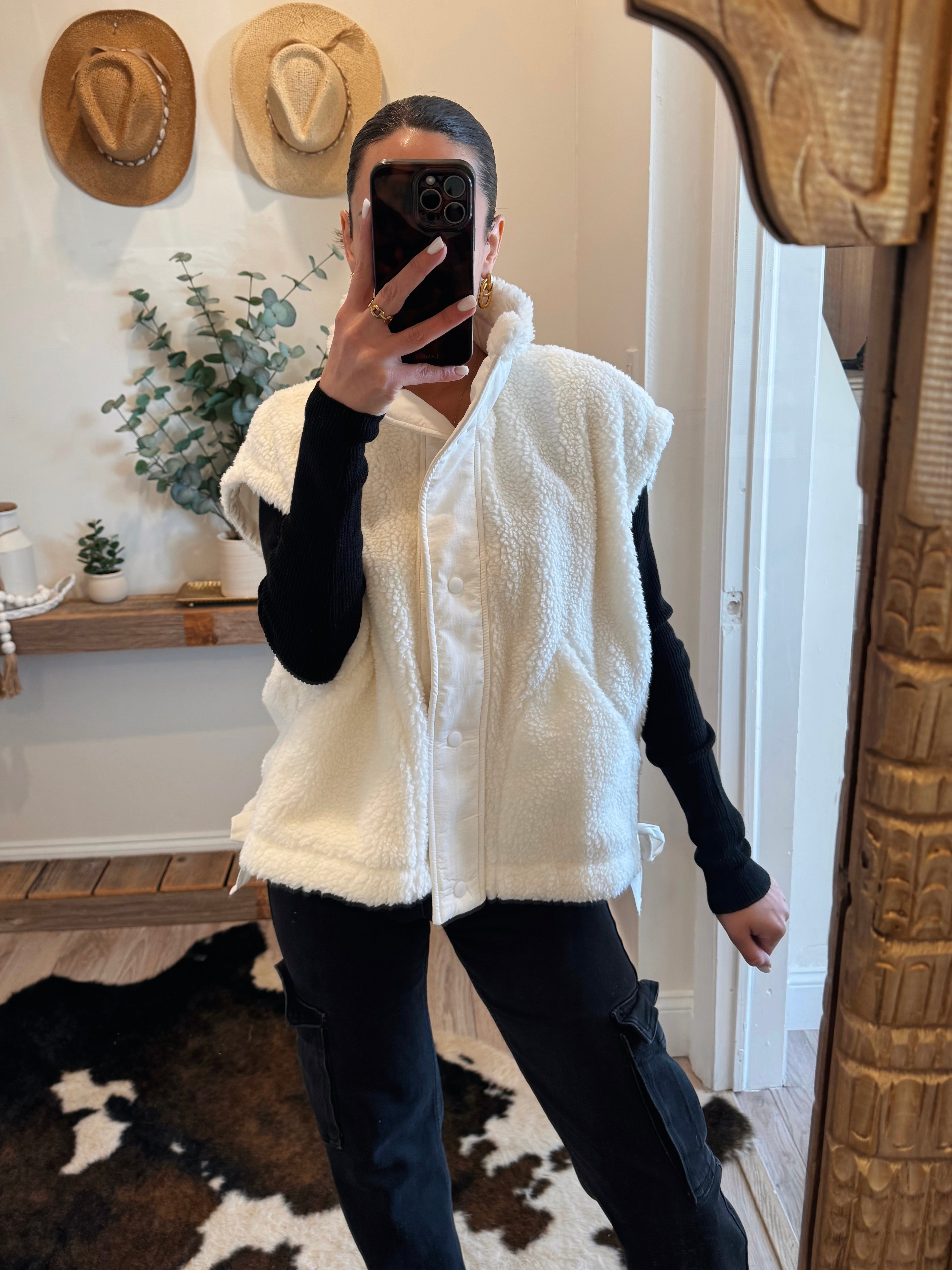 Product Features: Experience warmth and versatility with this sherpa vest, ideal for layering. It includes distinctive side tie-ups for a customizable, secure fit. Designed with a cozy mock neck and button-front closure for effortless wear.